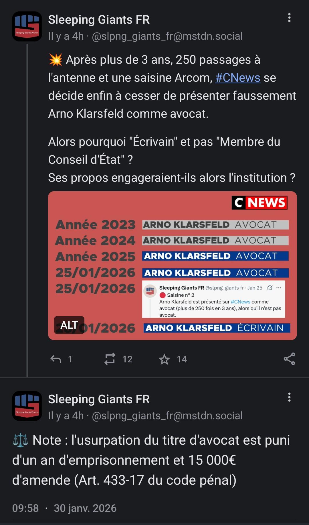 Alors que sur #Mastodon, le compte @slpng_giants_fr présente #ArnoKlarsfeld comme un avocat.