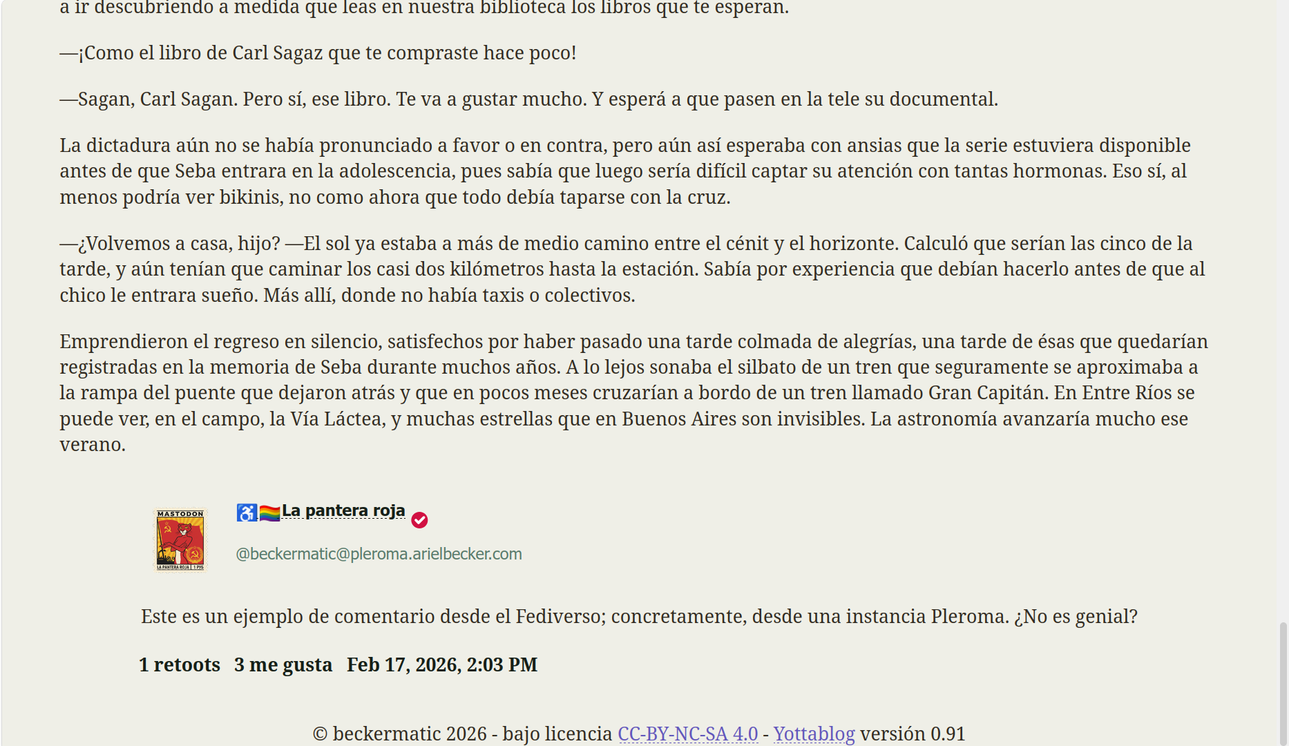 Estoy terminando un pequeño trabajito. El fin de semana ya voy a estar libre, y tengo muchas ganas de acometer un proyecto para nuestro Fediverso: un módulo de comentarios para Yottablog, motor ya está funcionando y se puede ver aquí.