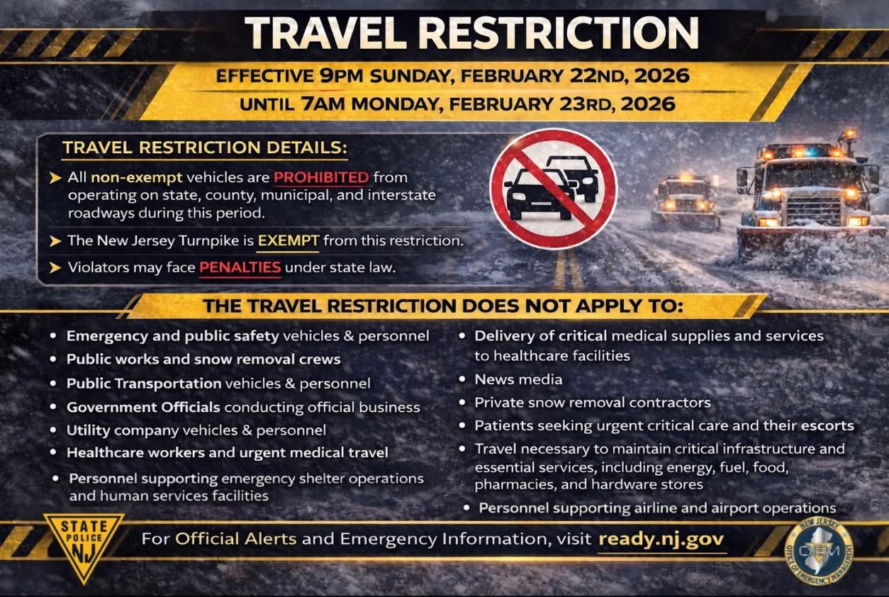 Due to the blizzard, there is a complete travel restriction for all of NJ from 9pm tonight to 7am tomorrow.