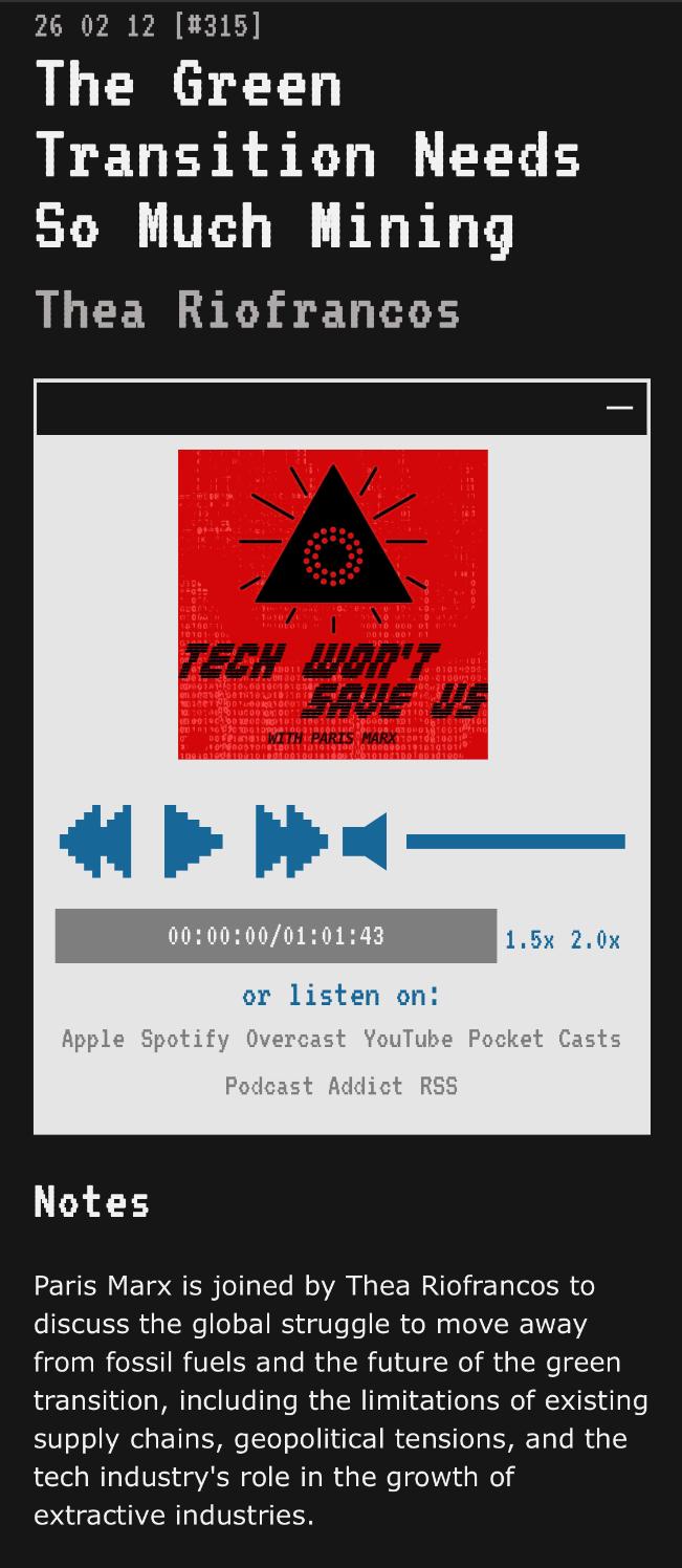 https://www.techwontsave.us/episode/315_the_green_transition_needs_so_much_mining_w_thea_riofrancos
