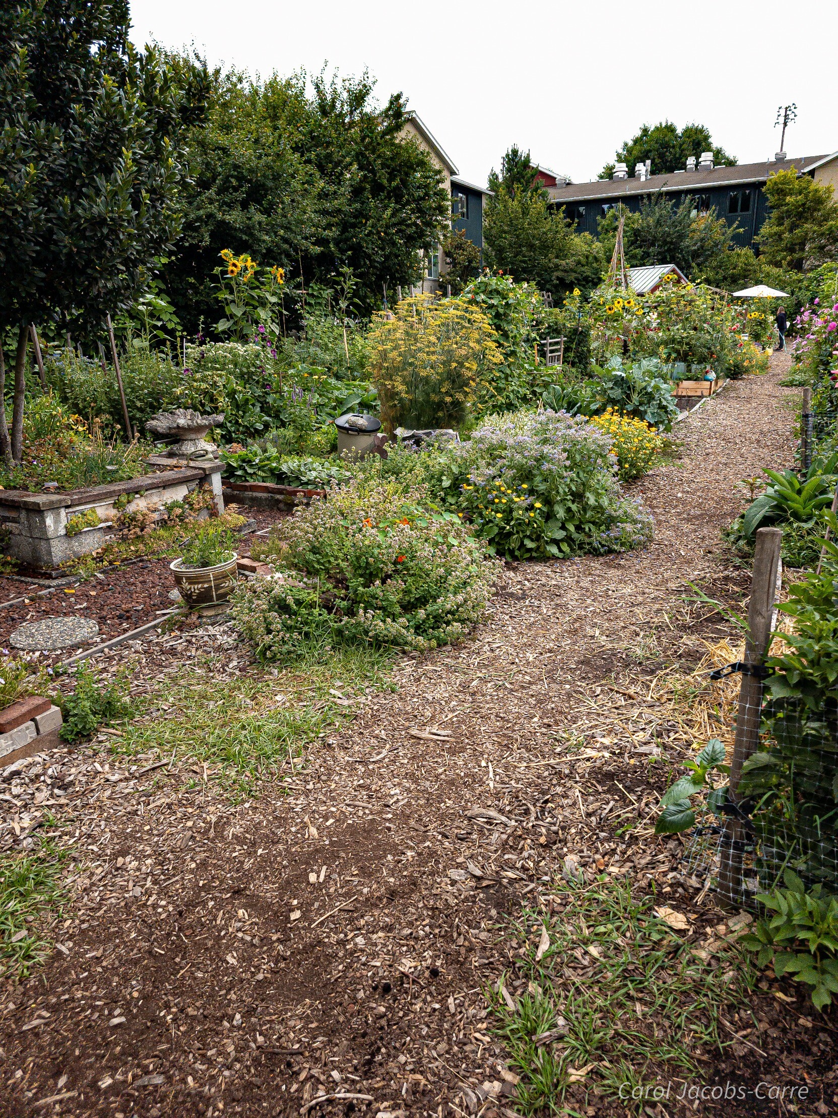 I did my daily gig at the Picardo Family Farm community gardens this morning. Seattle's system of community gardens is called the P-Patch system, because the Picardo family gave part of their farm for this purpose in 1973 and started the community gardens; this is how their name is memorialized. Here are a few photos of the P-Patch on a cloudy morning. Some of the gardeners have been here for decades, and they have built little beds with stones and bricks. I think there are more flowers than vegetables, but I managed to get a shot that looks very vegetarian. There are little alcoves and sitting areas around the edges, and umbrellas and tables scattered around in the bedding area.