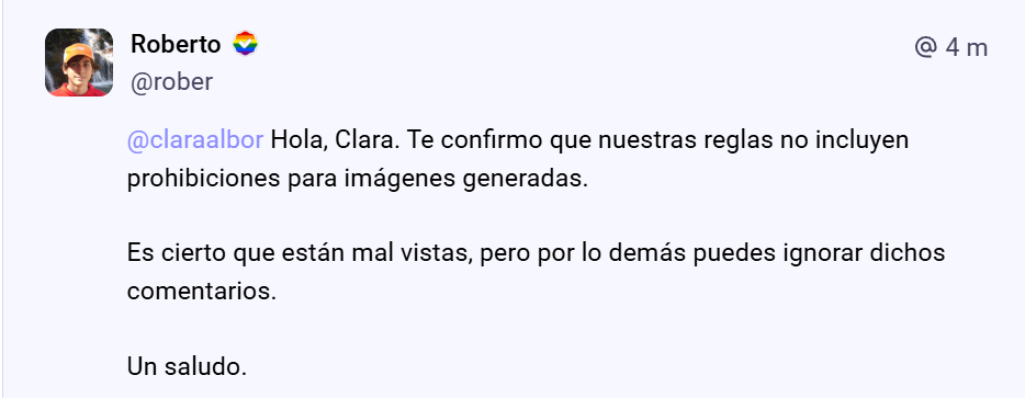 * Otra vez me toca escuchar que las imágenes generadas con IA “están mal vistas” en Mastodon y que mejor las oculte…