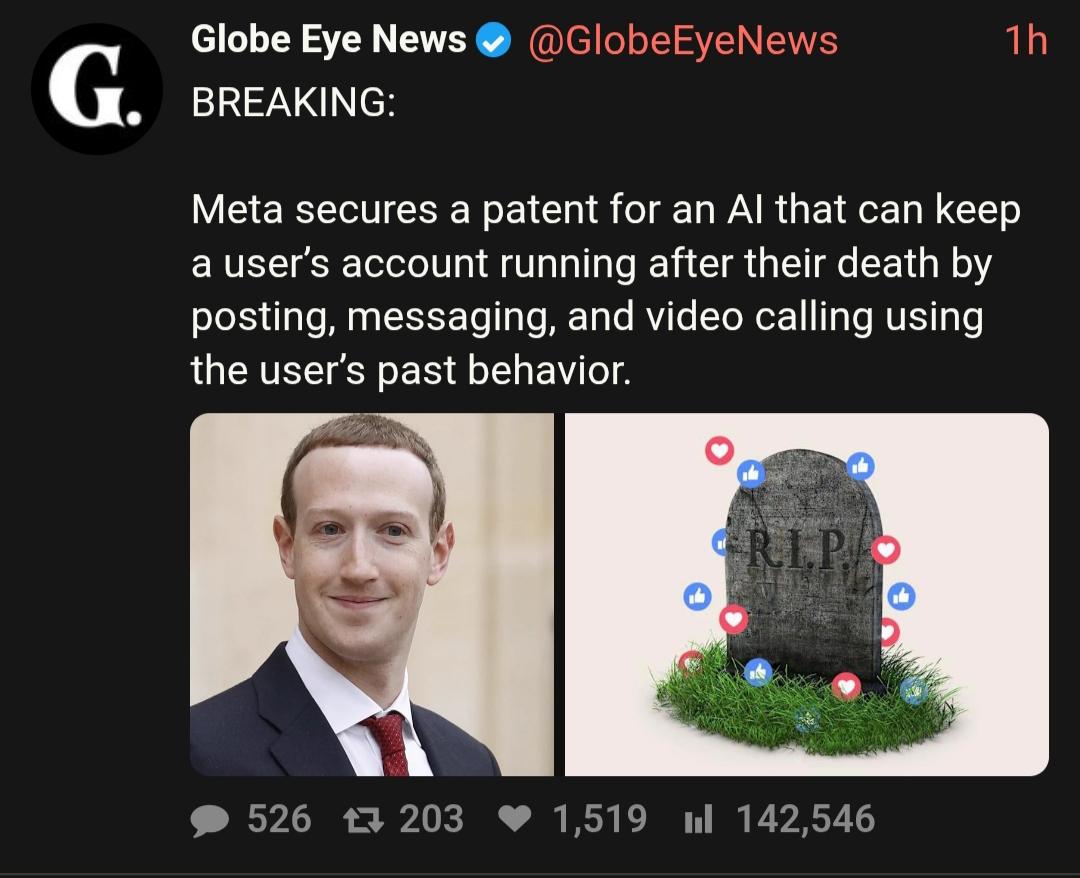 Meta has patented an AI system designed to keep user accounts active after death, using past behavior to post, message, and make calls.