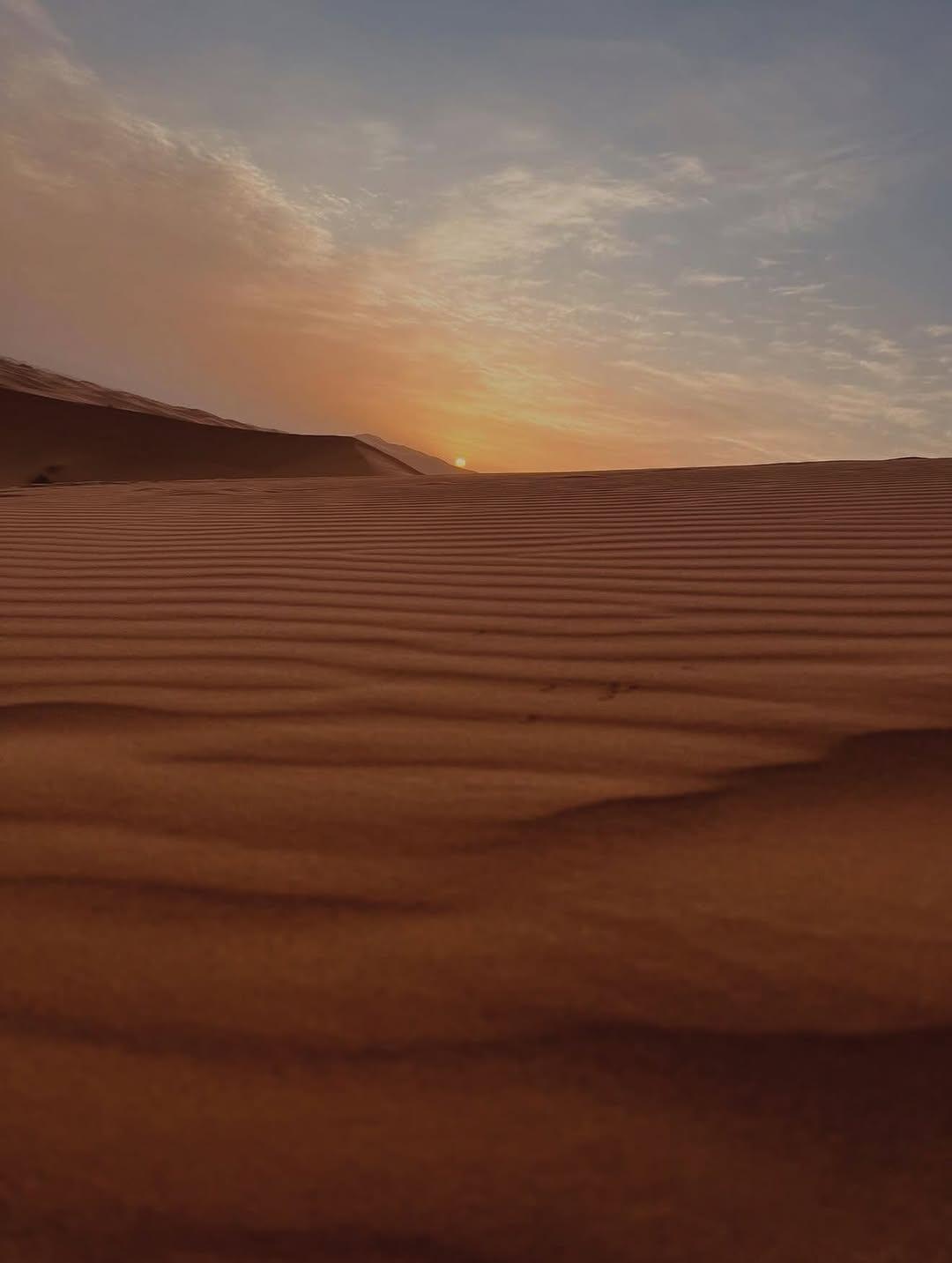 Wind-formed ripples on the sands of the Merzouga Desert at sunset.