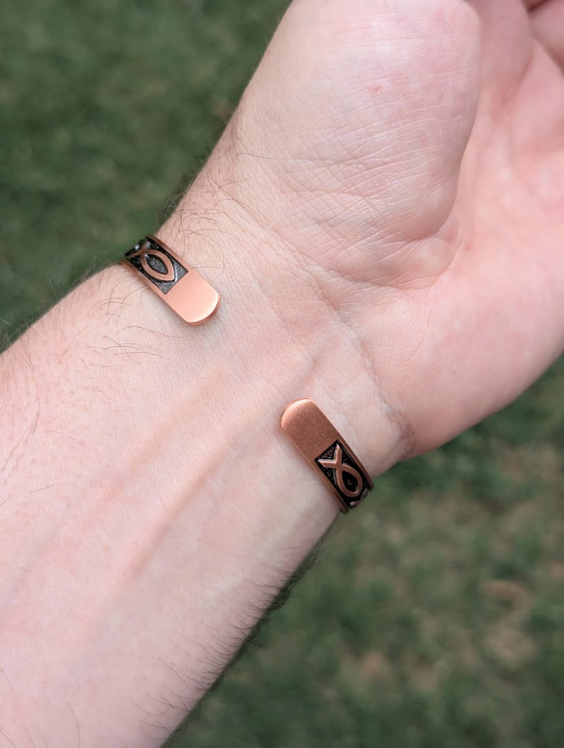 I got some new jewellery! (no, I wasn't expecting to proclaim that either) It's a bracelet? bangle? with a matching ring which both have Ichthys (line drawn fish often drawn in the sand by early Christians). Since we traditionally cover crosses and crucifix towards the end of Lent, and I normally wear a ring with a cross on it, I thought this made a nice physical reminder of the season. It said it was for men, I've never had a bangle before - what do you think?