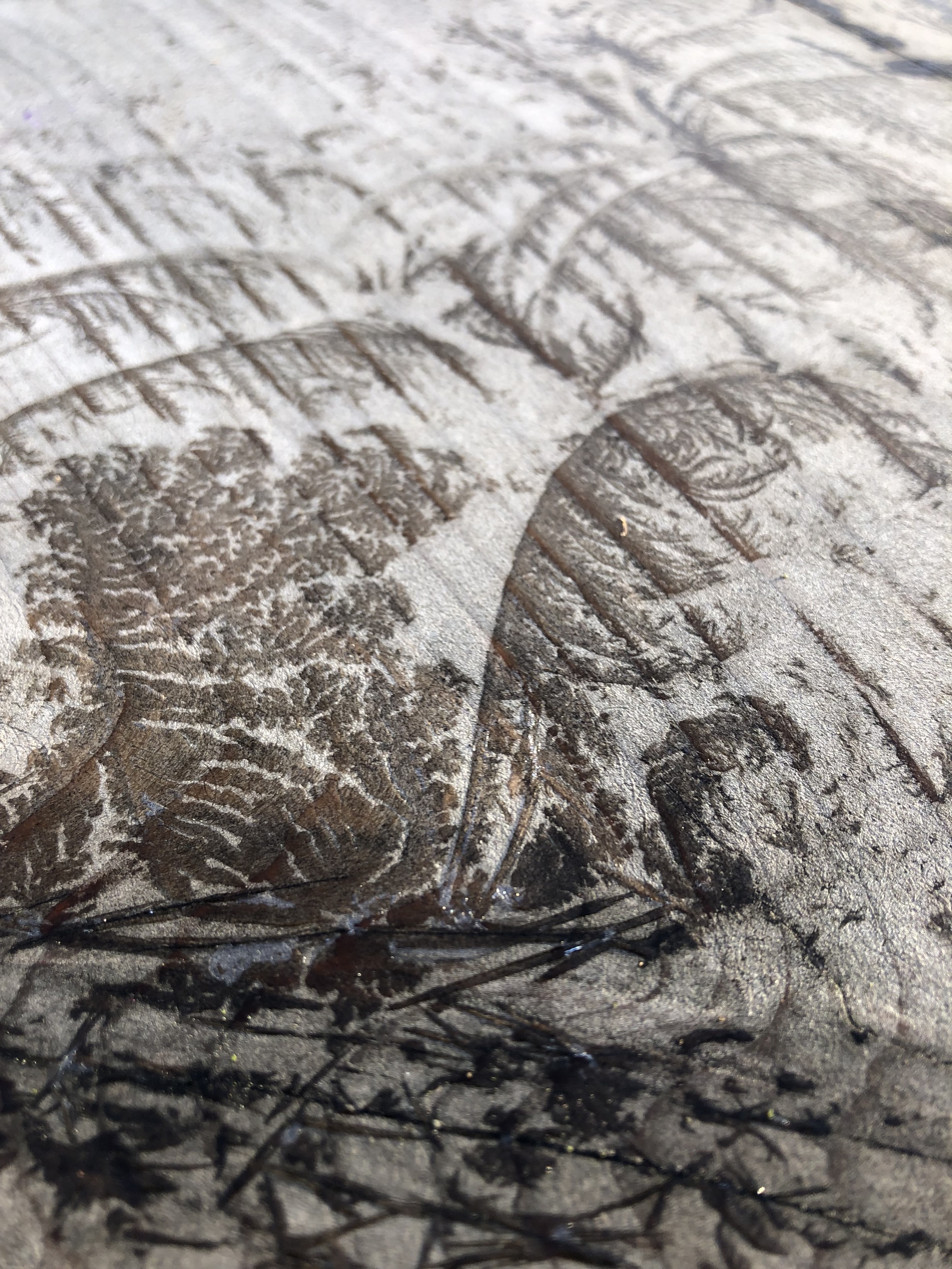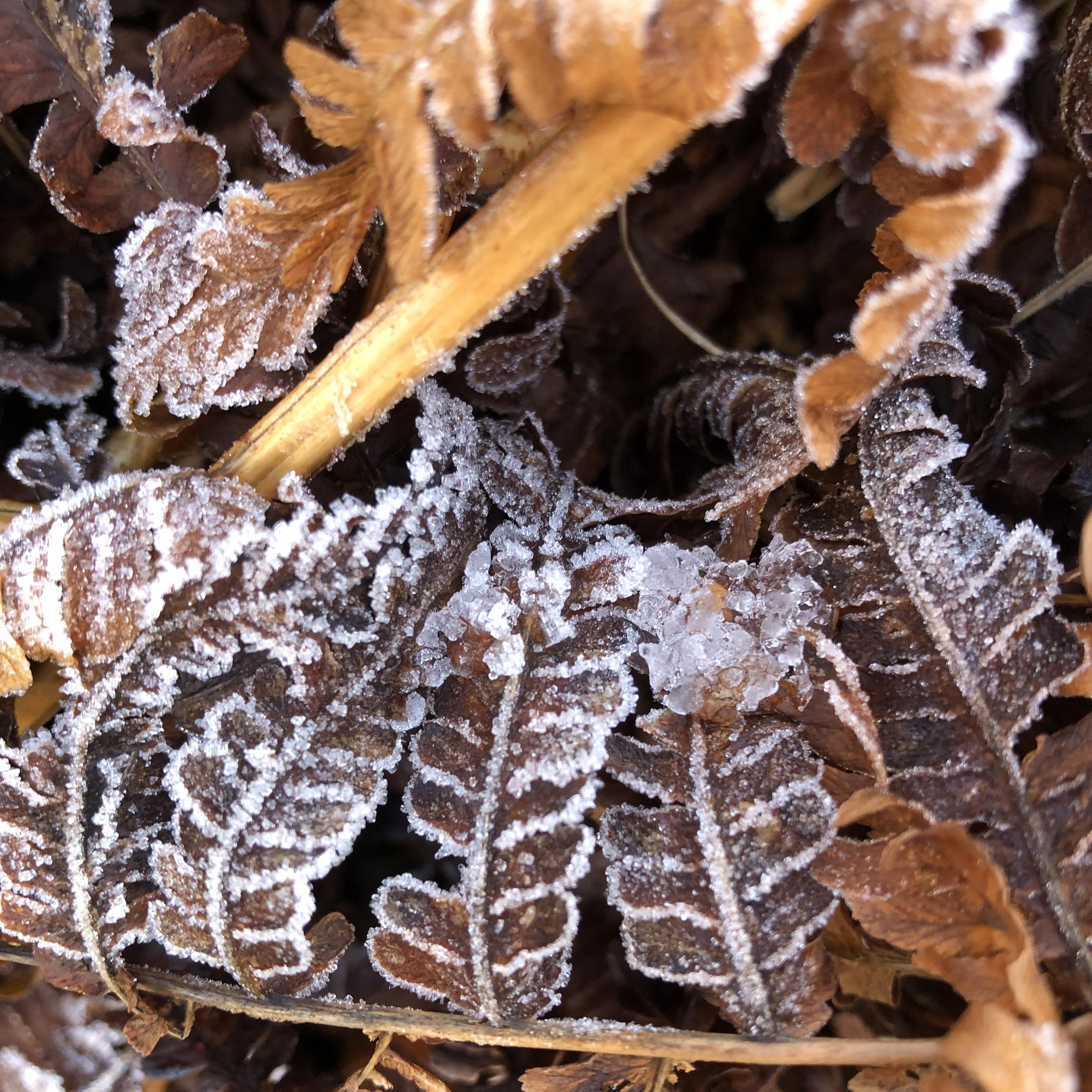 The way the frost interacts with the dead fern leaves we leave in the garden as sheltering spots for insects.