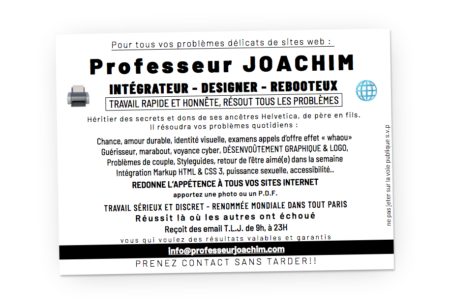 Je peux intervenir ponctuellement pour dépanner ou ça peut être un service récurrent, quelques heures par mois ou quelque chose de plus régulier, bref on discute et on s’adapte selon vos besoins !