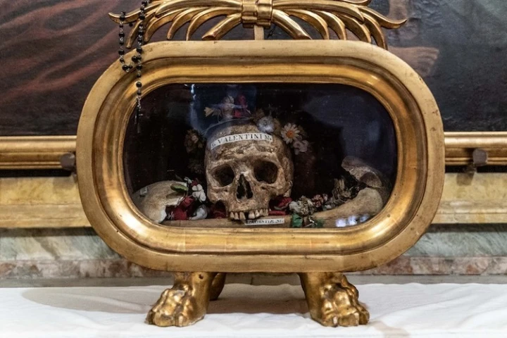 Hoy, el cráneo atribuido a San Valentín se exhibe en la Basílica de Santa Maria in Cosmedin, en Roma, coronado con flores secas dentro de un relicario.