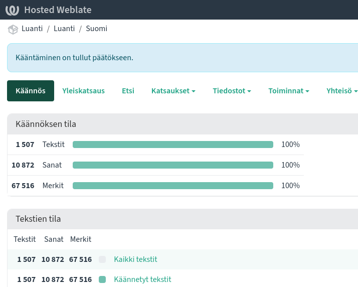 Viimeisenä isona urakkana on viirien kääntäminen (707 tekstikohtaa). Kaikki muu on käännetty, mutta vielä pitää odottaa, että käännökset päivitetään peliin.