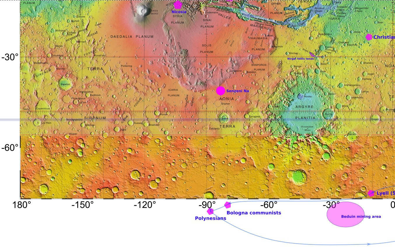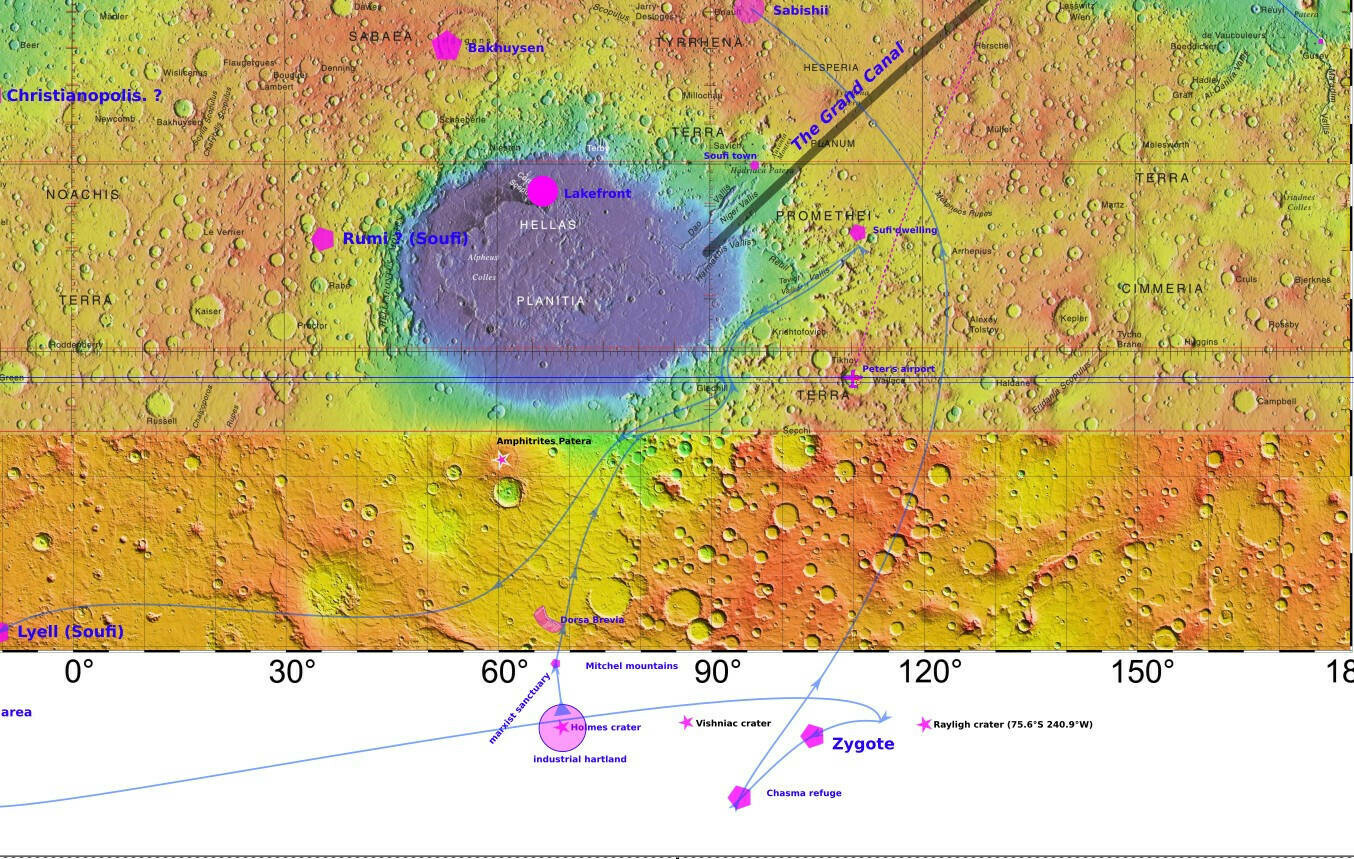 Here are some maps I made while reading the books several years ago, showing cities, places and plot info. The background is a USGS Topographical Map from Wikipedia: https://upload.wikimedia.org/wikipedia/commons/4/48/USGS-PlanetMars-TopographicalMap.png