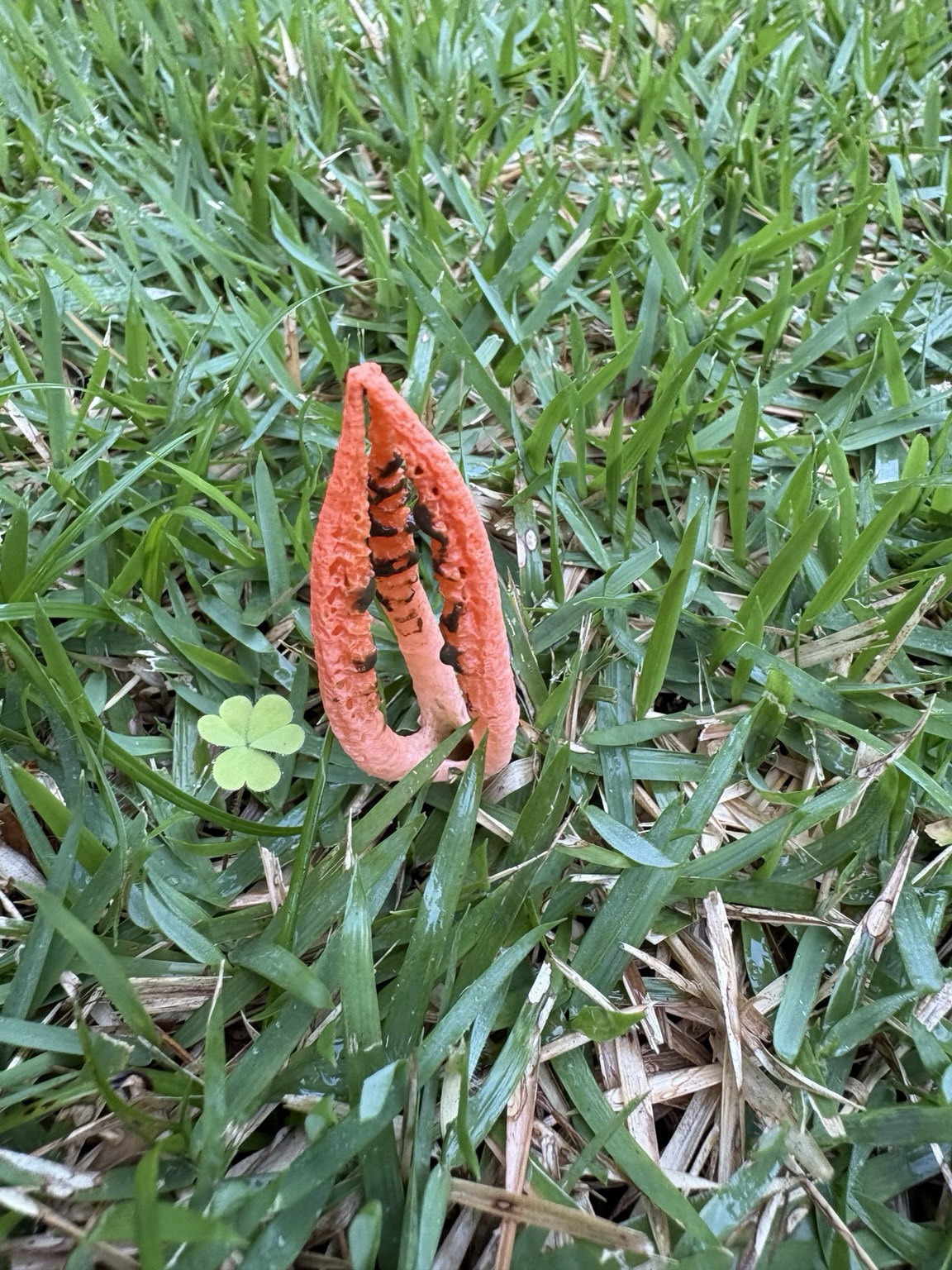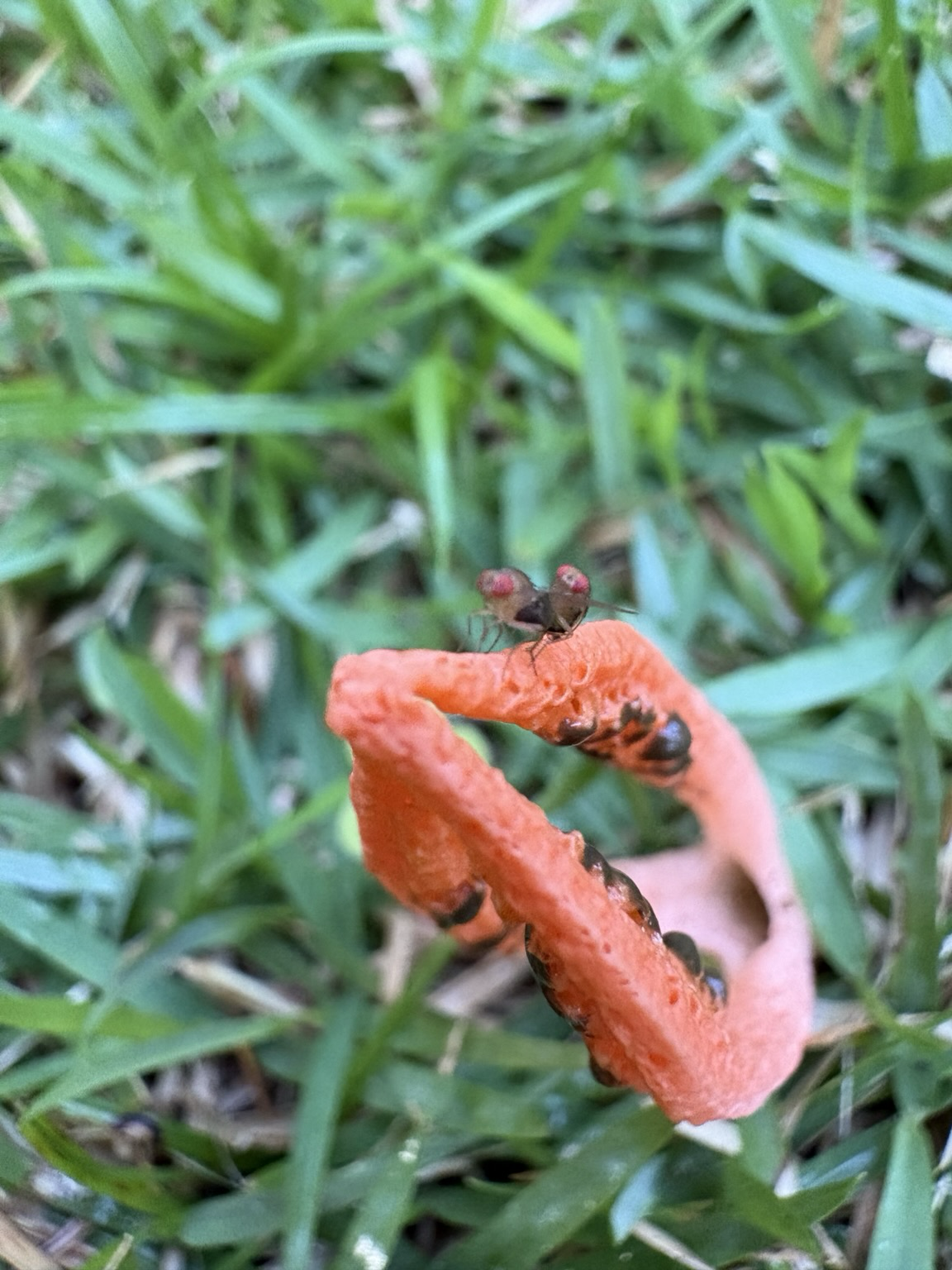 #fungi #FungiFriday #mushroom #mushtodon I found another of these very small, like 1 1/2 inch tall, type of stinkhorn mushroom in my yard! And if you look at the close-up, you’ll see fruit flies enjoying some together time! #love is Love 💗 #nature is so intriguing, #naturephotography in my #backyard #peace to all #mastodon & beyond ☮️