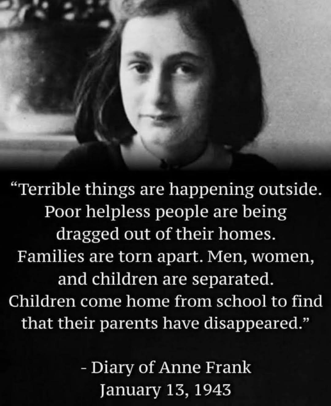 "Terrible things are happening outside. At any time of night and day, poor helpless people are being dragged out of their homes ... Families are torn apart: men, women and children are separated. Children come home from school to find their parents have disappeared." - Diary of Anne Frank, January 13, 1943