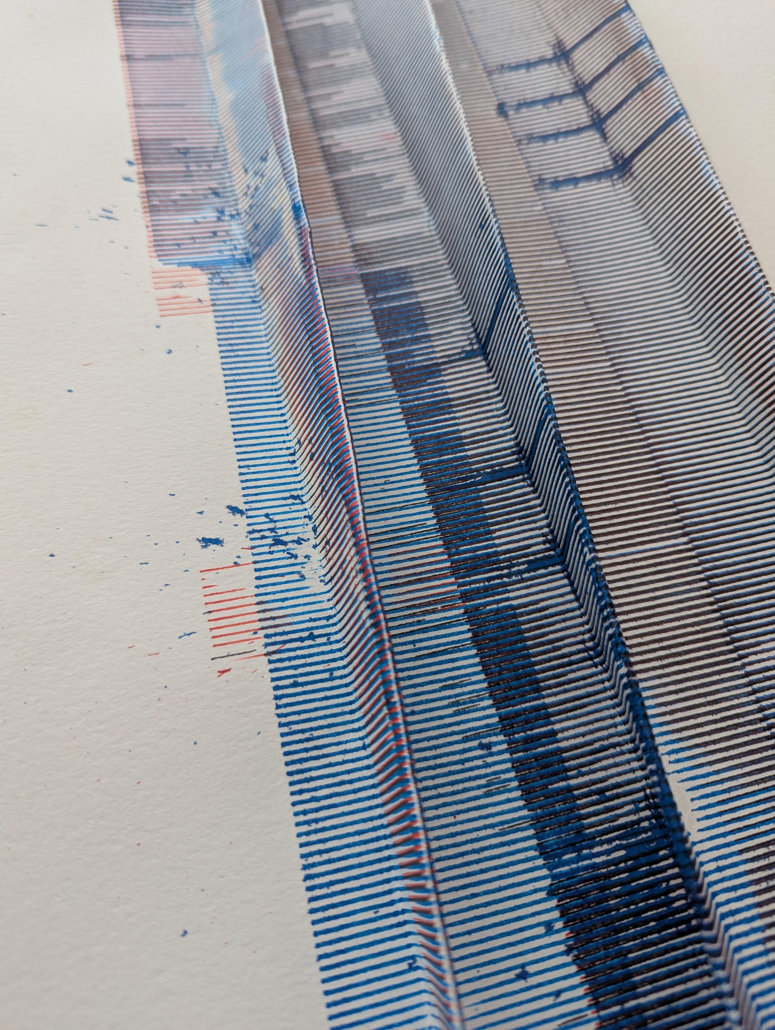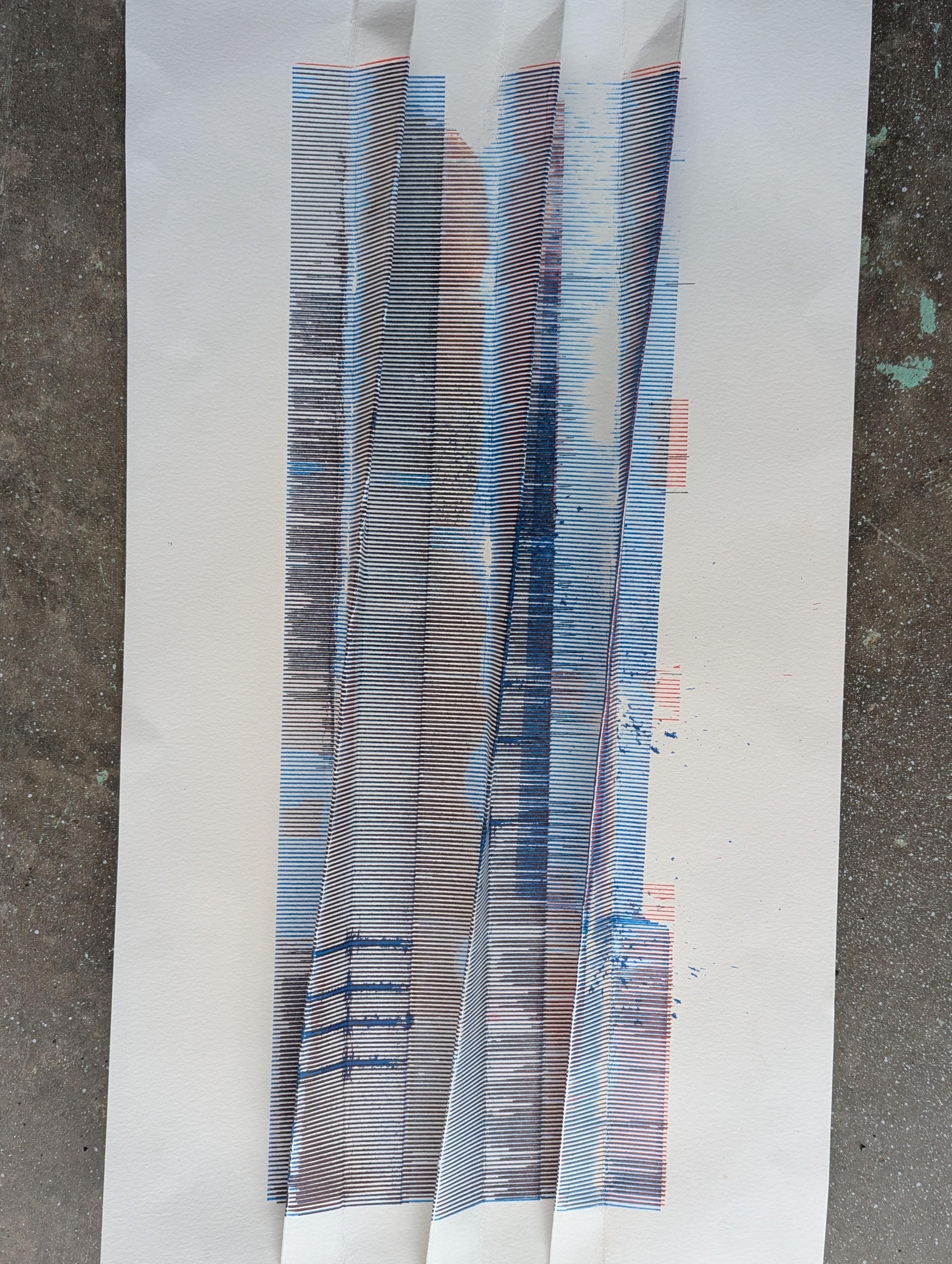 I've done smaller pieces with folds in the process but these are my first larger pieces. The simplest move is to fold, flatten the paper back out, and allow the texture to impact the plot.