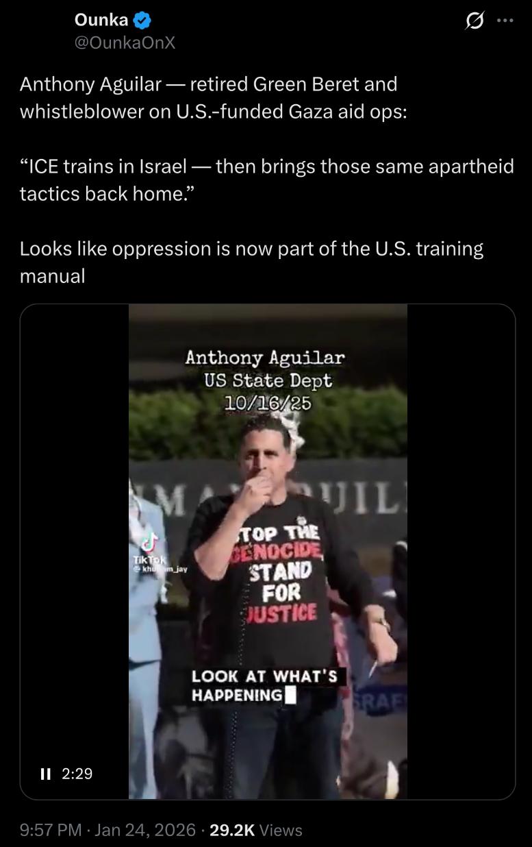 “ #ICE trains in Israel — then brings those same apartheid tactics back home.”