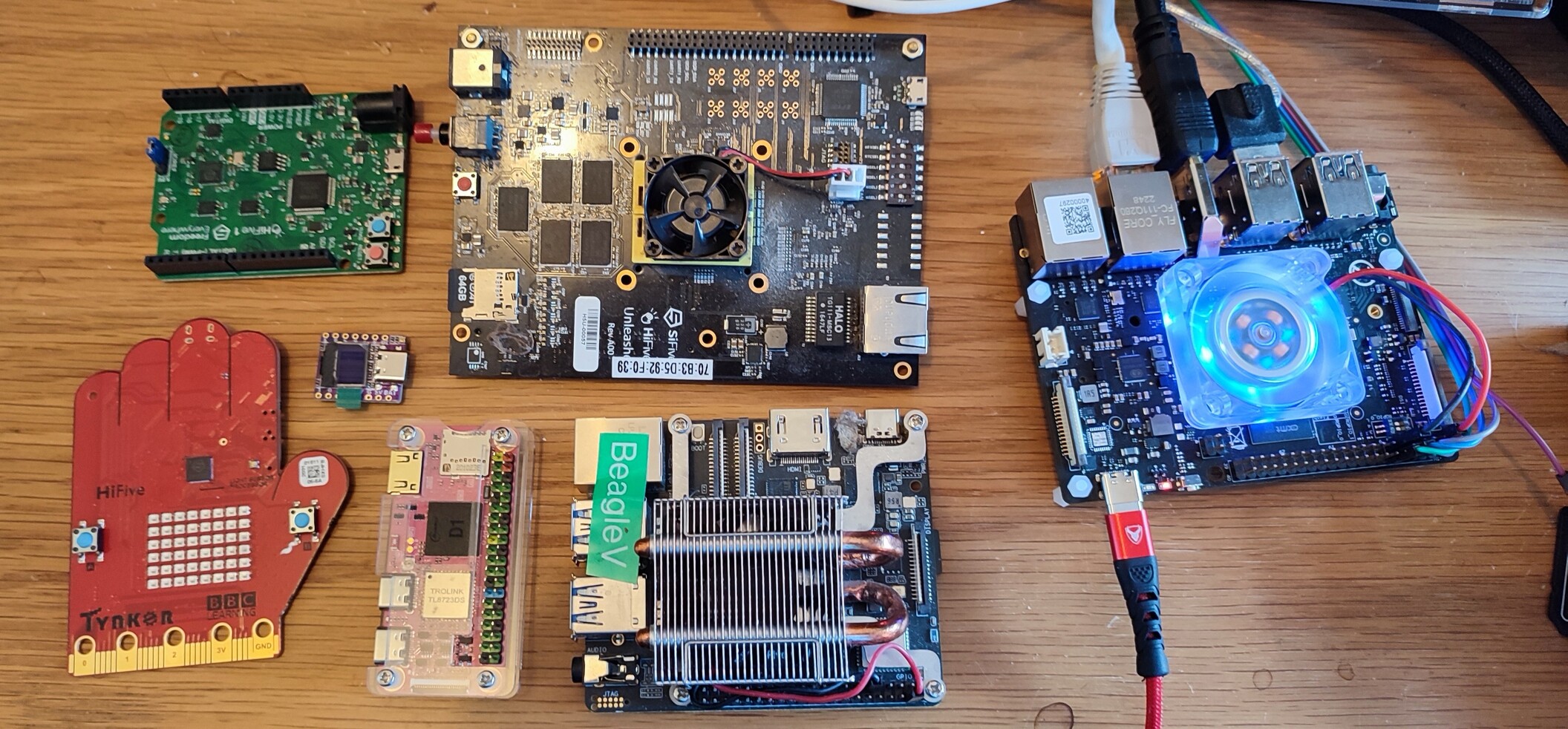 Current set of RISC-V boards ... From left to right - the first three are 32-bit, the others 64-bit. Most of these aren't used as much as they should be!