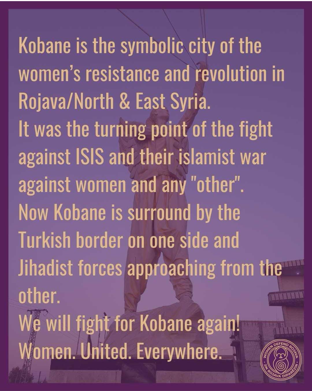 Kobane es la ciudad símbolo de la resistencia de las mujeres y la revolución en #Rojava (Noreste de Siria). Supuso un punto decisivo en la lucha contra el ISIS y su guerra islámica contra las mujeres y cualquier “otre”.