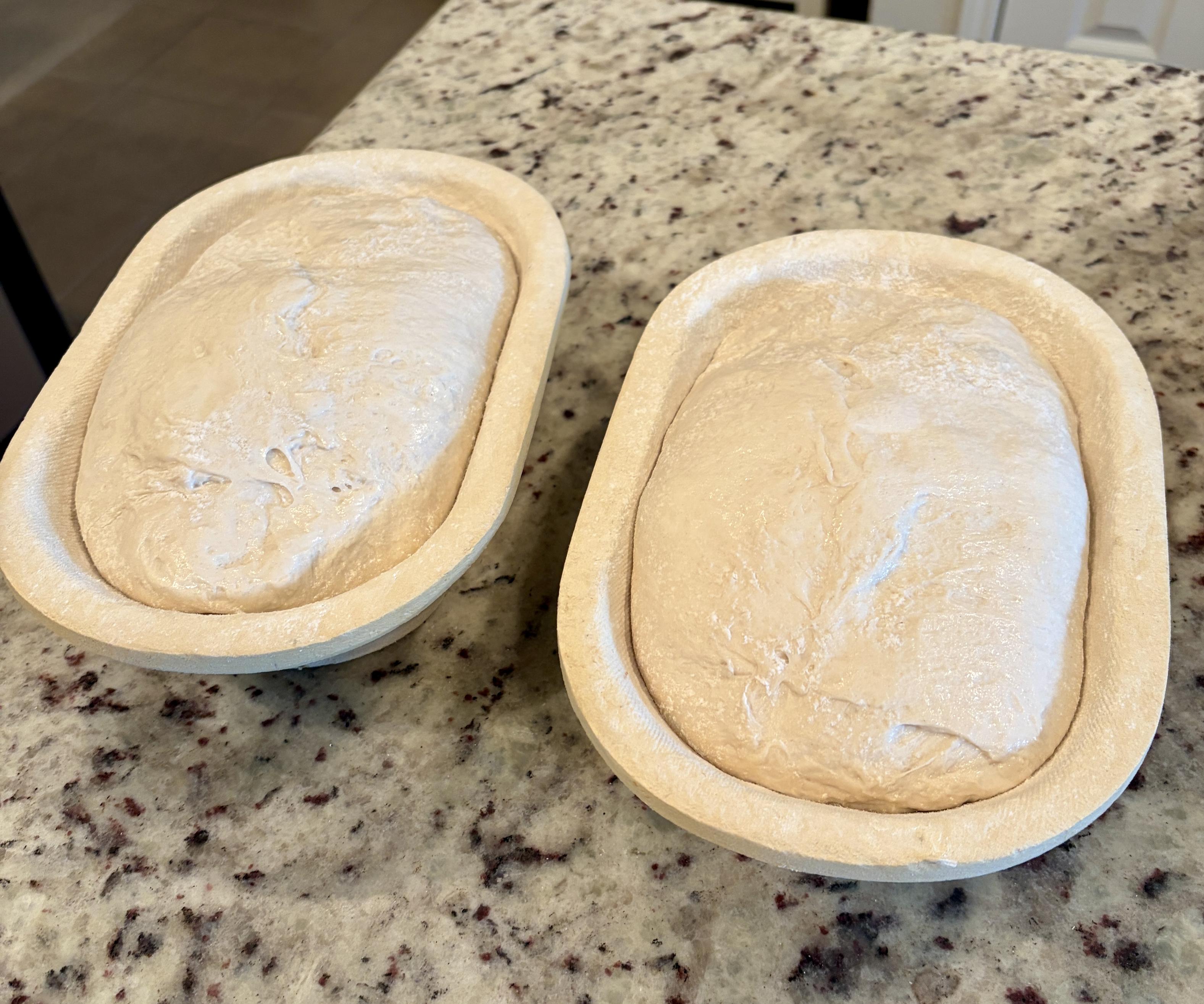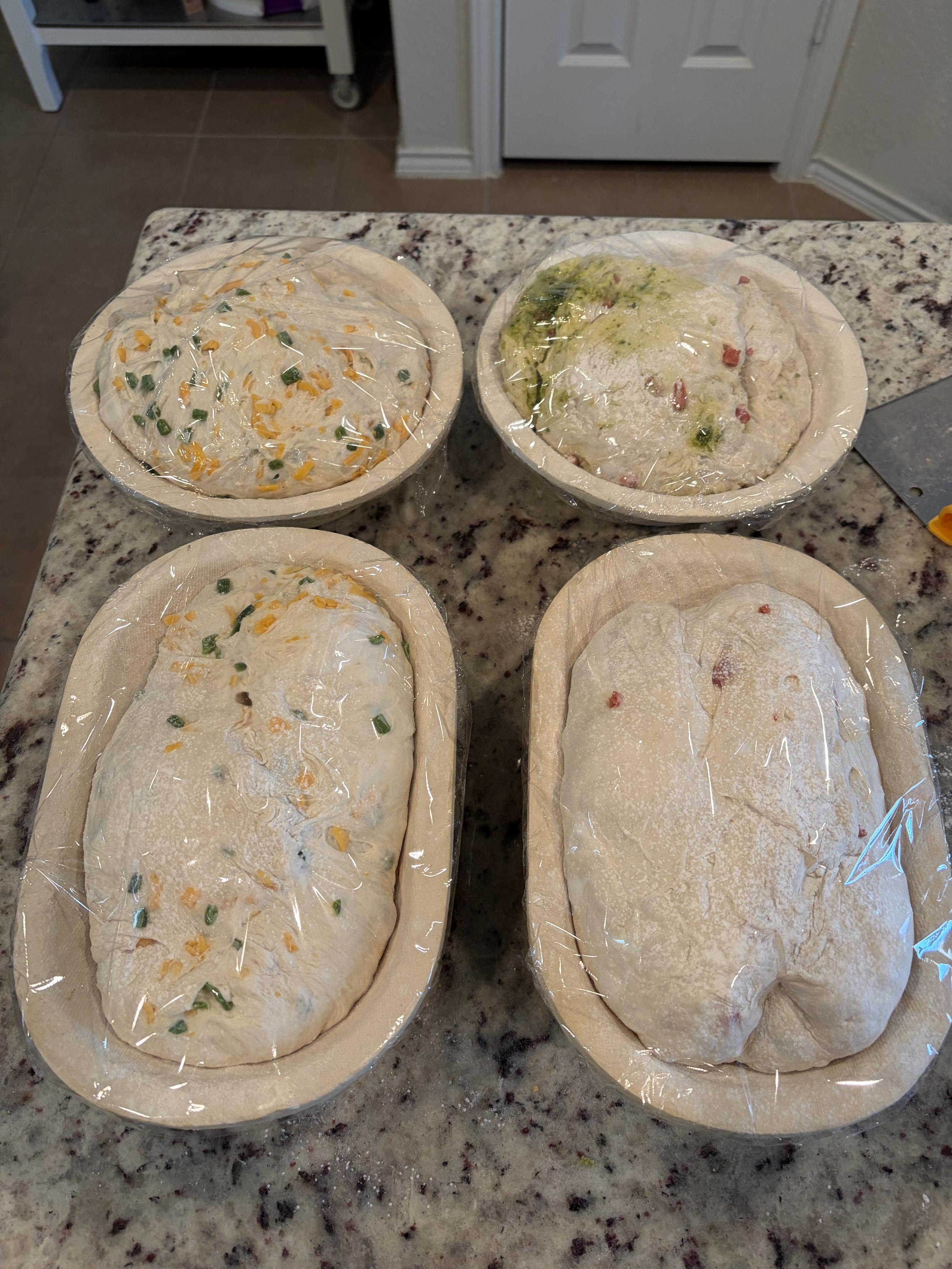 The first part of today’s bake ready for cold-proofing. I didn’t do a good job on the upper right loaf; the seam opened and I couldn’t close it because of the oily pesto. It will bake just fine. Right loaves: Mozz/Parm/Pepperoni/pesto. Left loaves: smoked cheddar/jalapeño. #sourdoughlife #MySourdoughJourney #sourdough #tangzhong #FDT