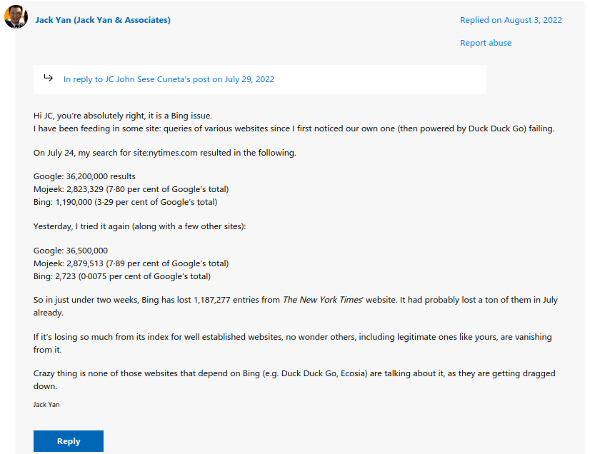 We are not talking about spam and questionable sites here, legitimate sites, even the New York Times, are disappearing from Bing results, and this is affecting DuckDuckGo, etc., which relies on Bing.