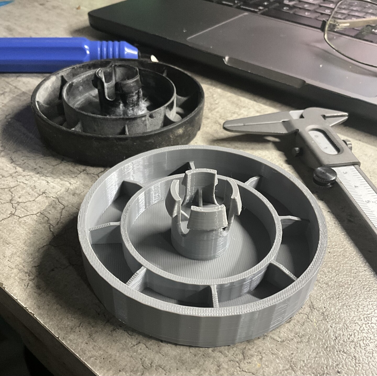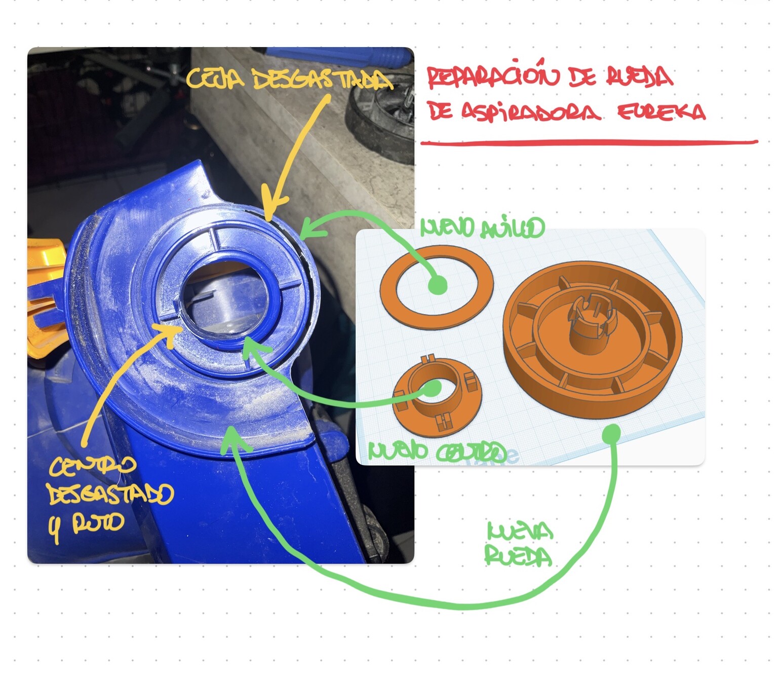 La reparación de la #aspiradora #eureka requirió más ciencia y rediseño de piezas: un centro reforzado, una ceja nueva, y una rueda con un centro más fuerte. Fueron varios días de trabajo, pero me gustó mucho el resultado. El pie de rey y #tinkercad fueron clave para esta solución.