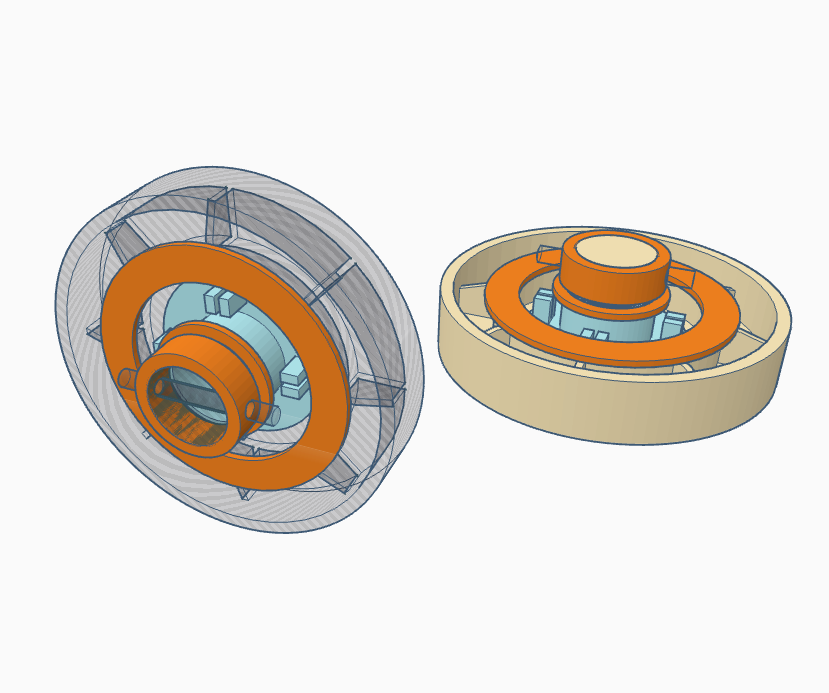 Diseño final del ensamble de remplazo de la rueda de mi aspiradora Eureka. Hubo que cambiar el centro y crear un anillo de sujeción. Si bien el diseño anterior es más parecido al original, el PLA no resulta ser el material más adecuado por su fragilidad. Este anillo resultó más fuerte y resistente.