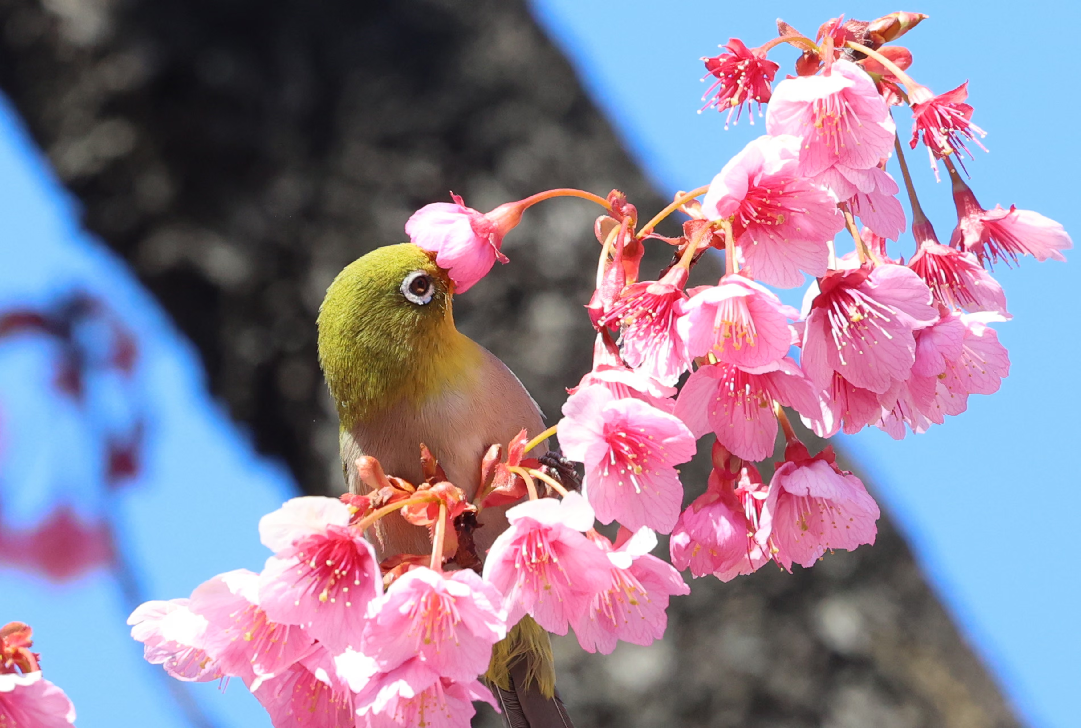 A bird perches on a branch of an early-blooming cherry tree at the Ebara shrine in #Tokyo