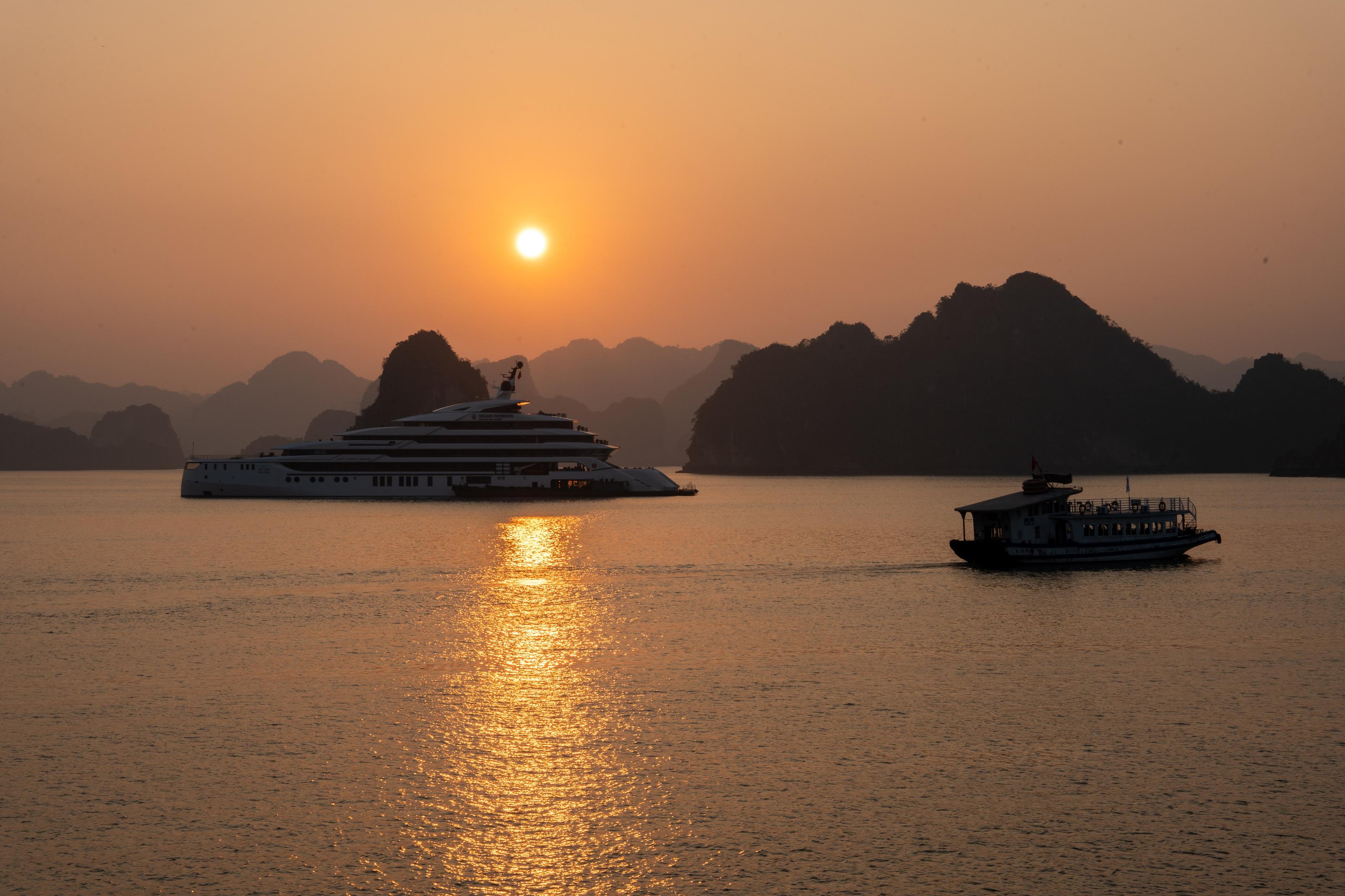 Halong Bay with limestone cliffs and boats in the Gulf of Tonkin north of Hanoi in Vietnam Southeast Asia