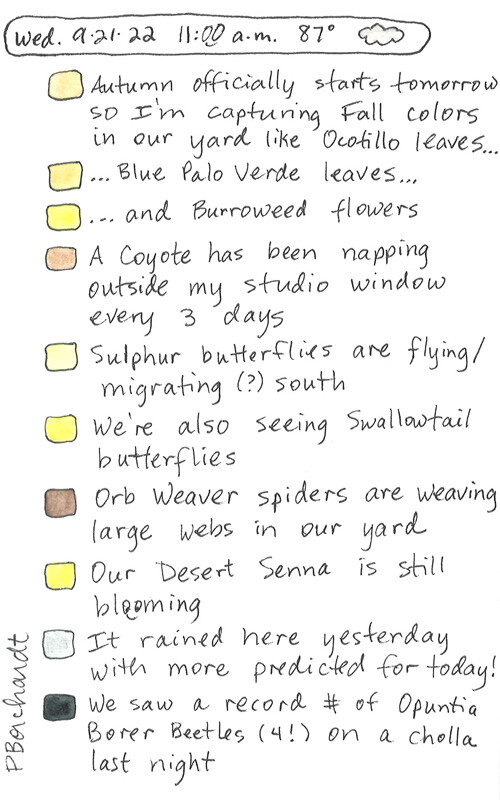 Here are 4 recent examples: Tucson Yard Journal, a monthly series highlighting amazing flora & fauna in my yard; 4 Perpetual Journal weekly entries; 9-21-22 nature journal (mostly text/little art); ocotillo & hummingbird (mostly art/little text).