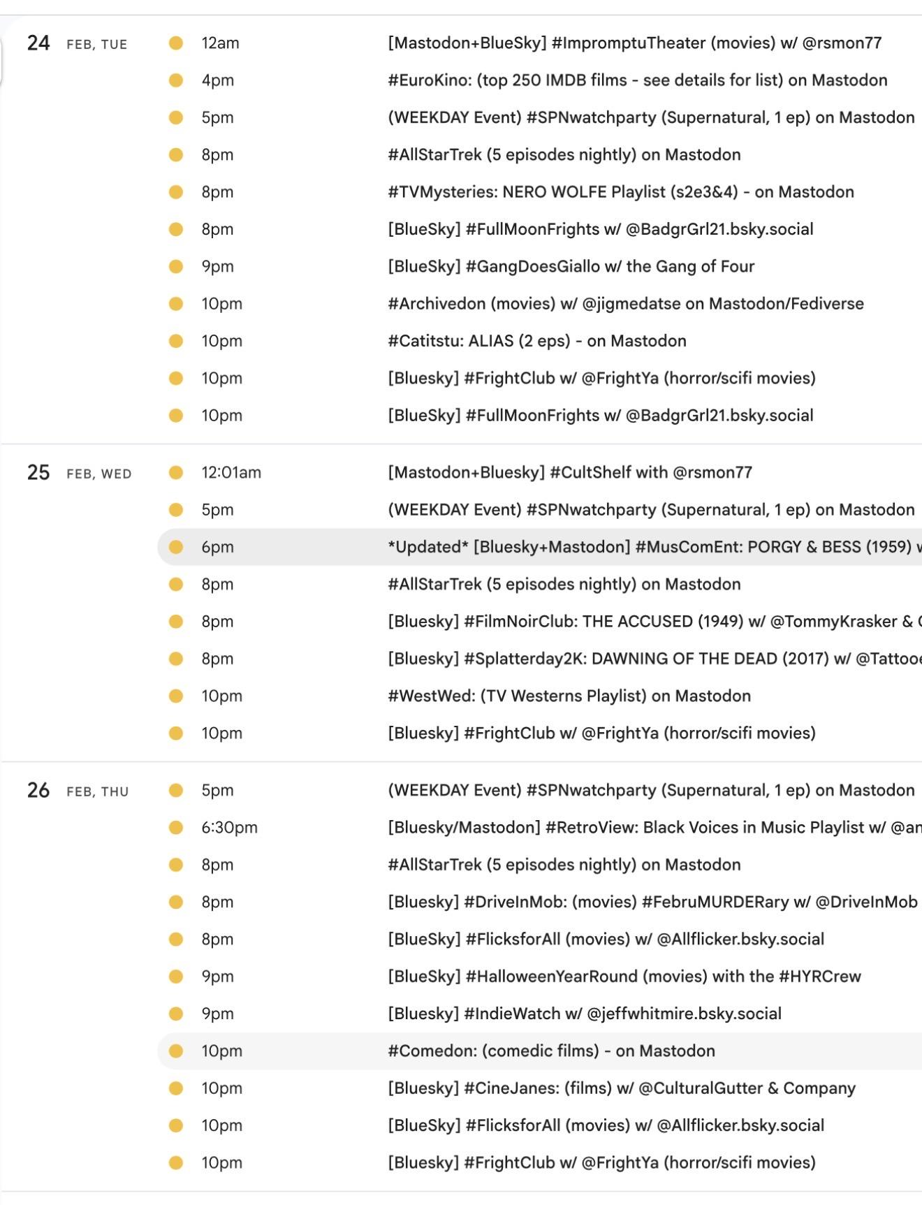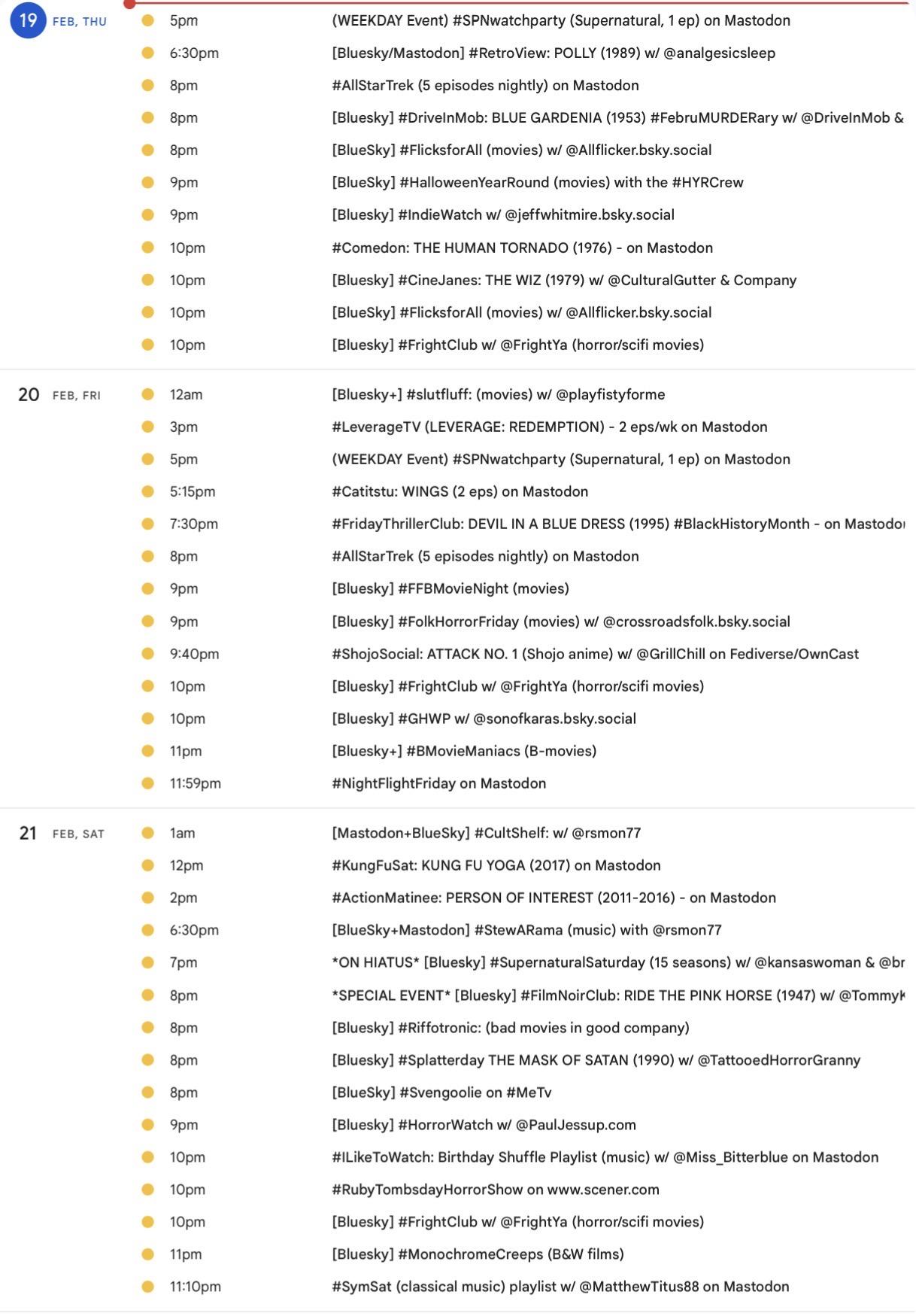 📆 It's the weekly #Mastodon/ #Fediverse #WatchPartyCalendar screencap for Feb. 19-26 (Thu-Thu)
